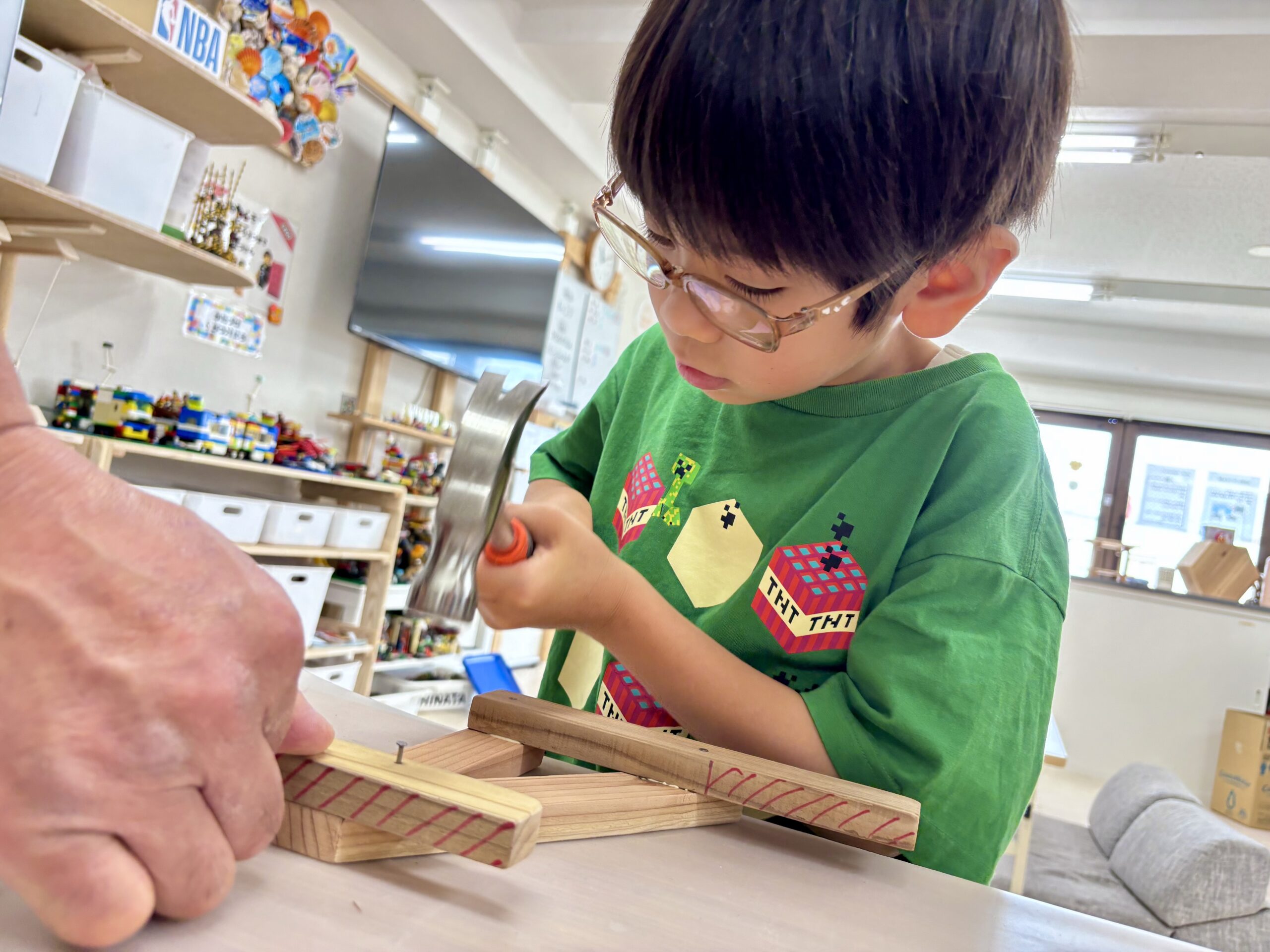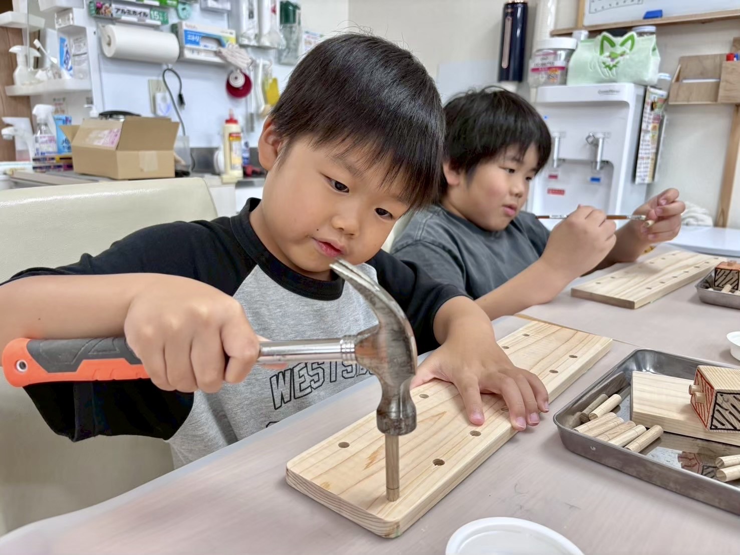 みんなで協力して、農園用のベンチやイスを作ったり、自分たちで想像して木材を組み合わせた作品を作ったりしています。